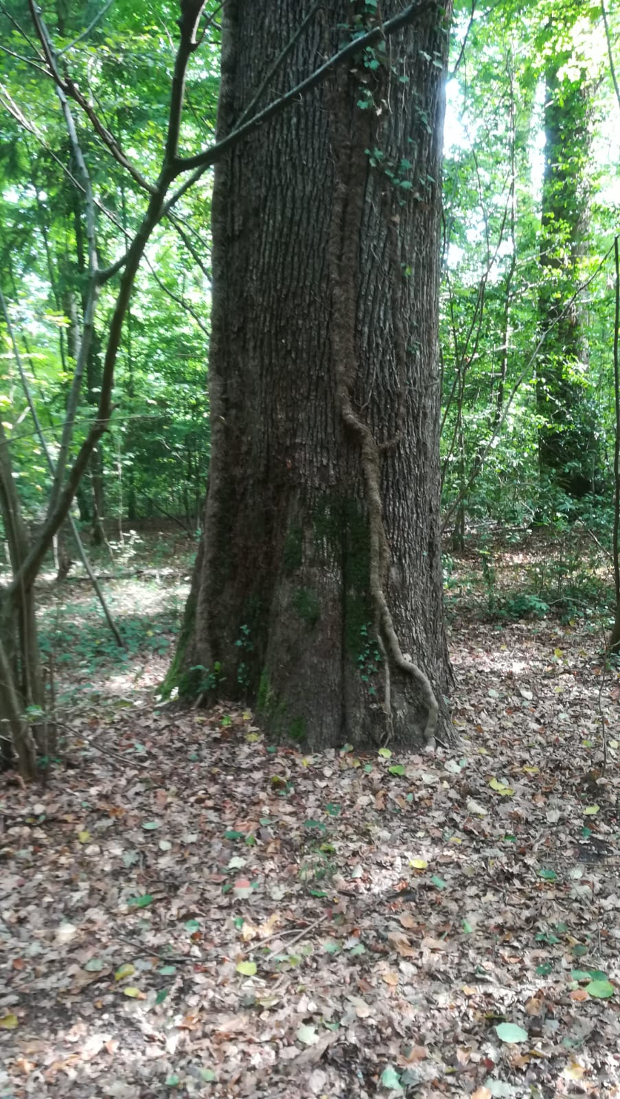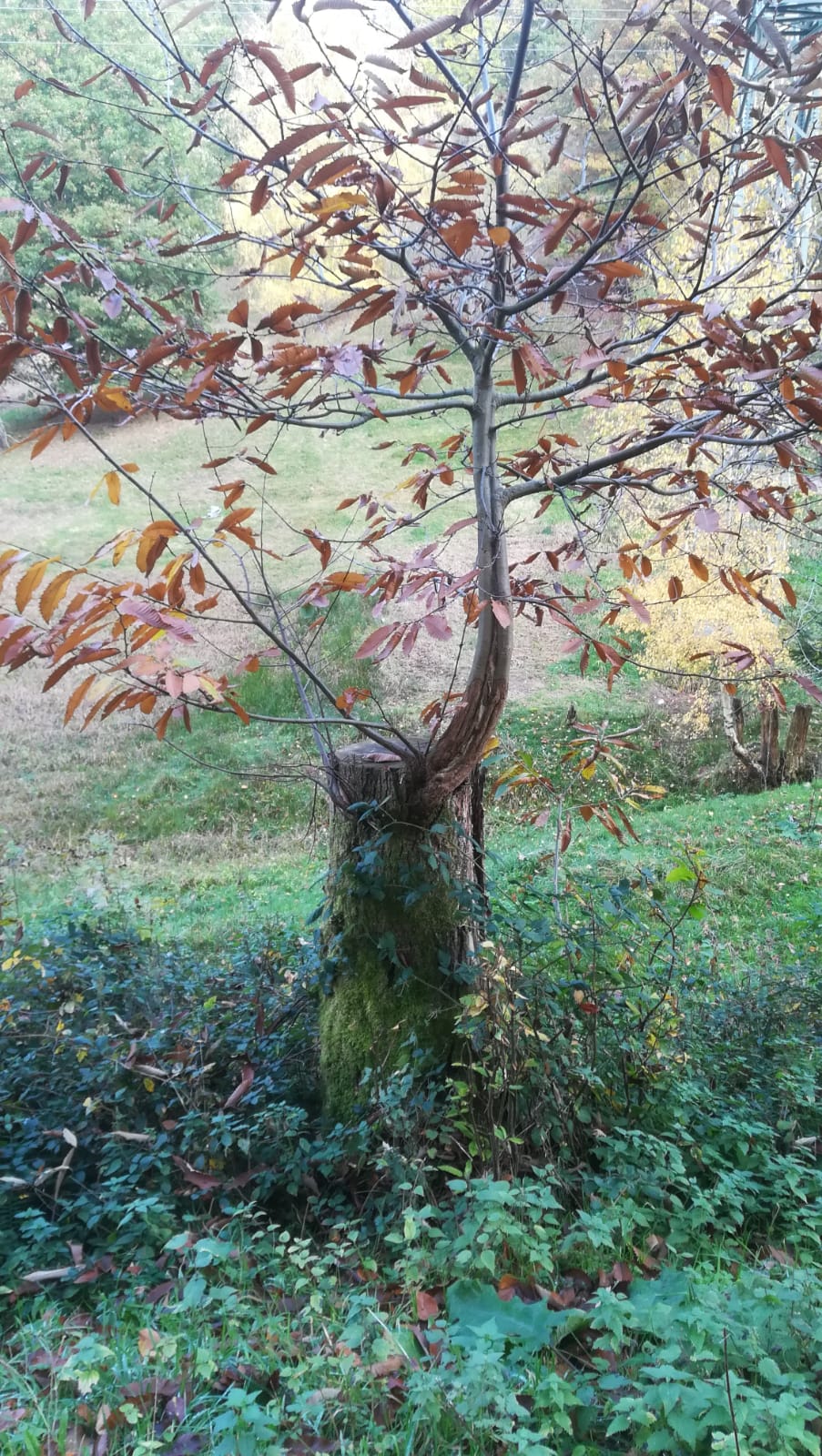 Diese Esskastanie hat einen unglaublichen Überlebenswillen. Vor Jahren wurde ihr Stamm abgesägt. Eine schlafende Knospe oder ein schon angelegter Zweig hat die Führung übernommen und bildet einen neuen Stamm aus. Er trägt die Blätter ins Licht um die Photosynthese zu gewährleisten. Sogar ein paar kleine Früchte hat er schon angelegt. Besser kann man das Thema Zuversicht nicht umsetzen.