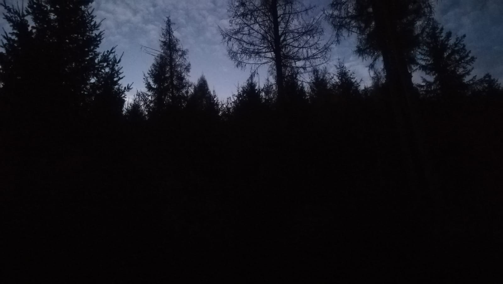 Angekommen im Revier wird das Auto abgestellt, die Ausrüstung geschnappt und dann geht es zum Sitz. Jetzt in der kälteren Jahreszeit ist ein wenig mehr zu tragen. Ein dicker Ansitzsack gehört für mich dazu, frieren muss nicht unbedingt sein. Der Weg ist gefroren und ich muss sehr vorsichtig zum Hochsitz gehen um nicht gleich das komplette Wild zu warnen. Dabei gehe ich immer an der bergseitigen Wegseite um die Schritte nicht zu weit klingen zu lassen. Der Hochsitz ist schemenhaft gegen den Himmel zu erkennen. Weil ich aber schon etliche Male hier gesessen habe hätte ich ihn vermutlich auch bei dickem Nebel gefunden. So, jetzt einrichten in dem kleinen Häuschen und schnell in den wärmenden Ansitzsack geschlüpft. Auch das Laden der Waffe ist schon längst ein automatischer Vorgang. Funktioniert selbst bei totaler Dunkelheit. Muss es auch, Sicherheit ist schließlich kein Luxus. Nachdem ich schon ein paar Minuten hier oben verweile habe ich das nachfolgende Bild geschossen.