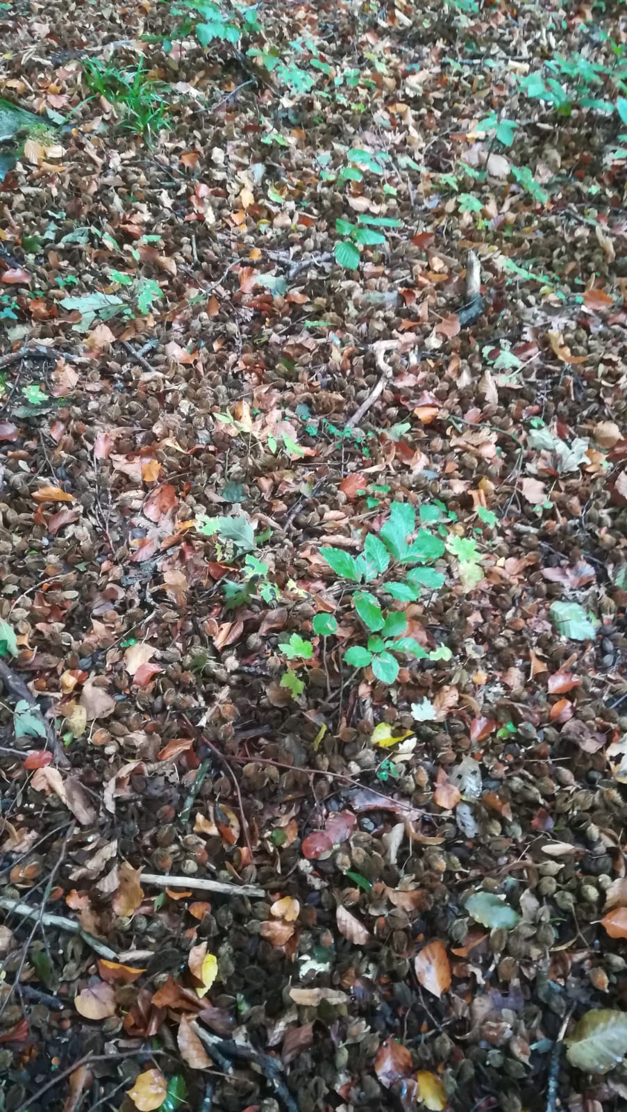 Bucheckern in einem Buchenbestand in Kuppenheim. Man geht darauf wie auf einem Teppich aus Korken oder ähnlichem. Da freuen sich die Eichhörnchen und die Wilde Sau. Das Paradies auf Erden. - Nun zu der Frage warum fruktifizieren die Waldbäume so stark. Früher wurde gelehrt dass alle 10 Jahre eine Vollmast (alle Bäume eines Bestandes tragen Früchte) bei den Eichen vorkommt. Diese Zeiträume werden immer kürzer. So zumindest mein Empfinden. Viellecht sehe ich das auch nicht ganz korrekt. Ich denke dass die Klimaerwärmung und die damit einhergehenden vermehrten Windereignisse zu einer verbesserten Befruchtung der Bäume sorgt. Und der Trockenstress den die Bäume jetzt schon seit Jahren ertragen müssen veranlasst sie dazu alles in die Produktion von Nachkommen zu stecken. Auf der einen Seite ist das eine erschreckende Entwicklung, auf der anderen Seite sage ich mir oft, dass die Natur (und hier vor allem die Bäume) sich schon zu helfen weiß. Das zeigt sie schon sehr, sehr lange.