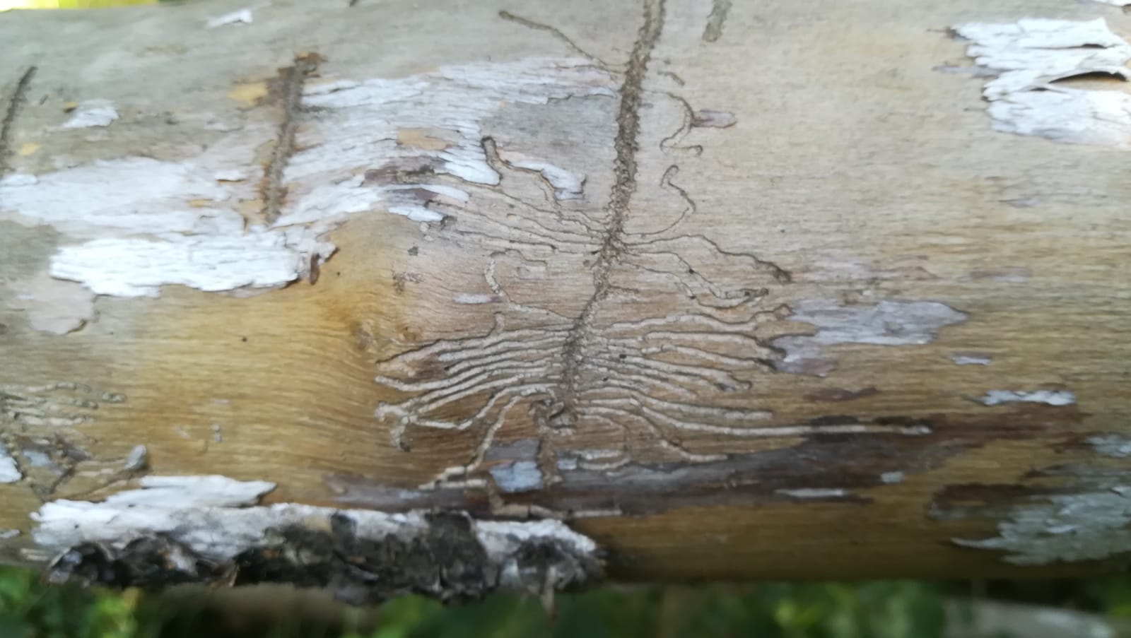 Ein Bekannter zeigte mir einen Baum in dem "Viecher" drin sind. Ich konnte ihn beruhigen. Sie waren schon wieder draußen. Der Baum war ein Ahorn. Und auf dem Foto kann man gut erkennen wie der Mutterkäfer einen Längsgang gefressen hat. An diesem Hauptgang wurden die Eier abgelegt und die Larven daraus haben sich nach außen gefressen. Die Entwicklung passiert unter der Borke, man sieht es erst wenn der Baum trocken wird und die Borke (Rinde) abfällt. Die Entstehung der Käferpopulation läuft in der sogenannten Wachstumsschicht (Kambium) ab. Dies ist die Zone an der ein Baum in die Dicke wächst. In ihr verlaufen grob gesagt die Leitungsbahnen die Wasser und Nährstoffe transportieren. Werden diese unterbrochen stirbt der Baum ab. Landläufig werden diese Tiere die den Baum zum Absterben bringen Borkenkäfer genannt.