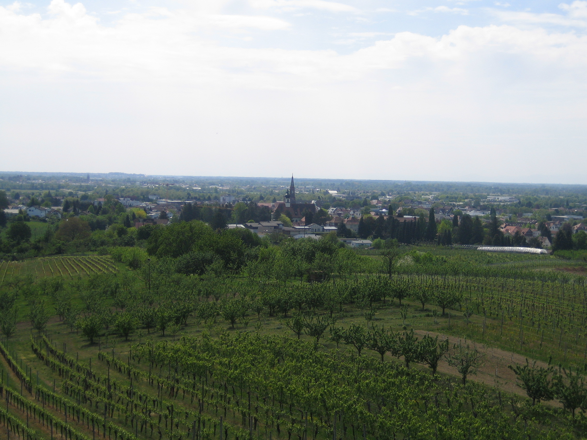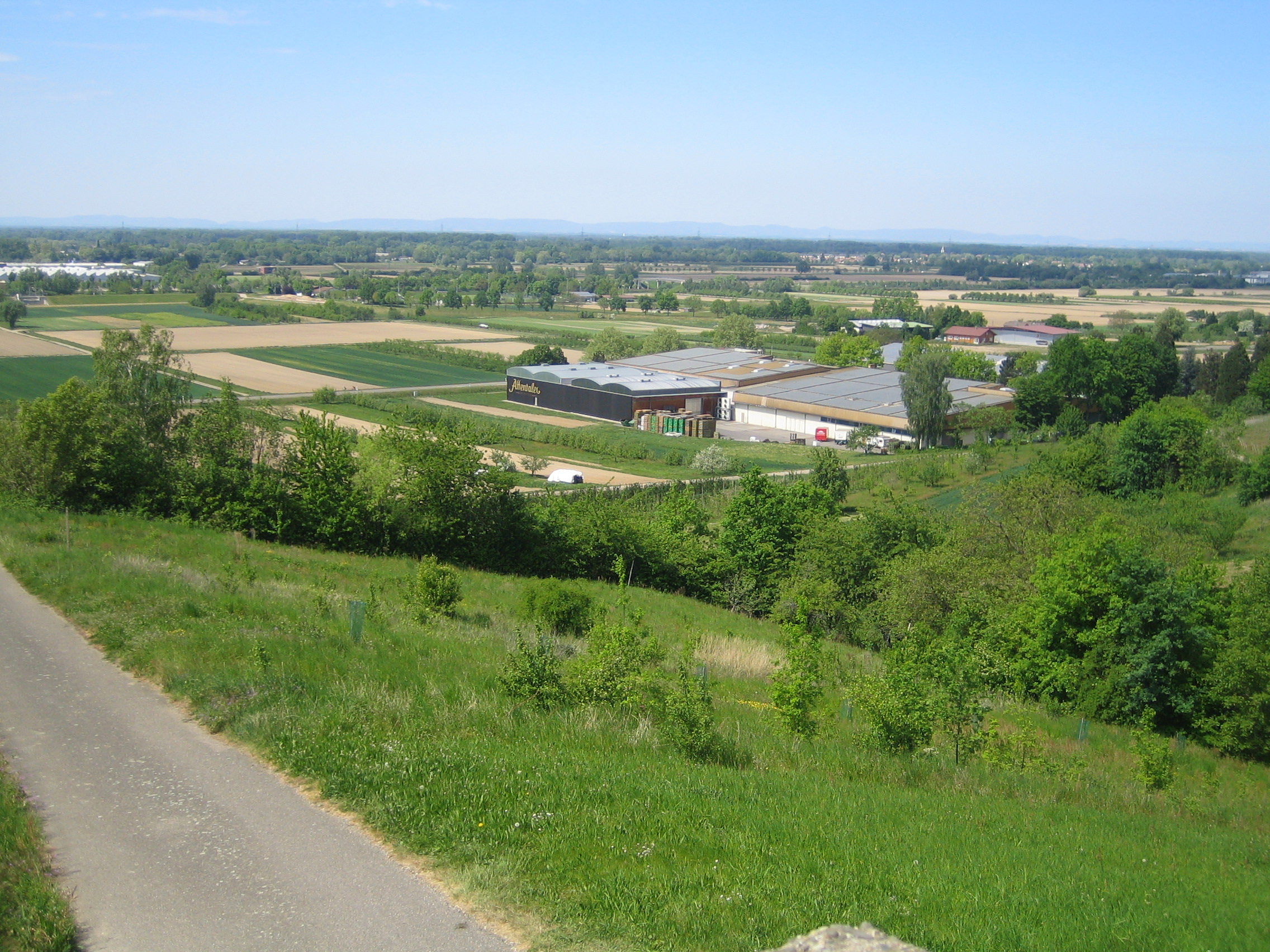 Blick in die Rheinebene, im HIntergrund schemenhaft im Dunst sind die Vogesen zu sehen