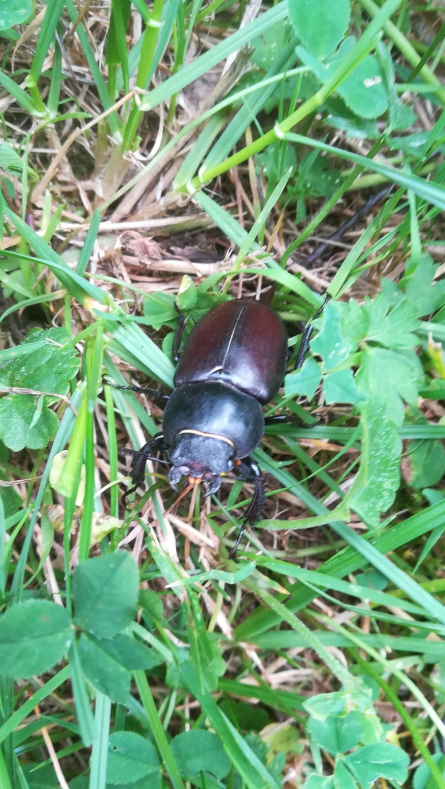 Schon wieder auf dem Heimweg kam sie angeflogen. Unüberhörbar, mit einem leicht nach hinten geneigten Körper flog sie an mir vorbei um nach wenigen Metern im Gras zu landen. Es war ein Weibchen des Hirschkäfers. Dieses Jahr scheint ein "Hirschkäferjahr" zu ein. So viele wie dieses Jahr habe ich noch nie gezählt. Und das freut mich sehr.