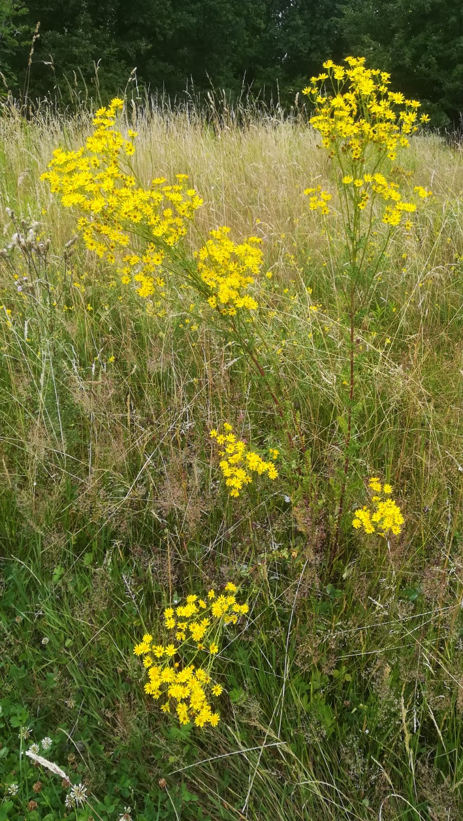 Jakobskreuzkraut, ist eine Pflanze aus der Familie der Korblütler. Für Weidetiere gefährlich, aber sie fressen sie nicht. Ausser sie ist im Heu, dann riechen sie es nicht und können daran sterben. Auch falls es in den Honig gelangen würde wäre es nicht gut. Die darin enthaltenen PA´s (Pyrrolizidinalkaloide) sind für die Bienen ungiftig, können aber zu Leberschädigungen bei Menschen führen wenn sie in großen Mengen und über einen längeren Zeitraum aufgenommen werden. Neuere Untersuchungen kommen zu dem Schluß dass sich die PA´s im Honig nach ein paar Monaten so weit abbauen und reduzieren, dass sie nicht mehr nachweisbar waren. Dennoch ist es ratsam die Ausbreitung dieser Pflanze zu verhindern.