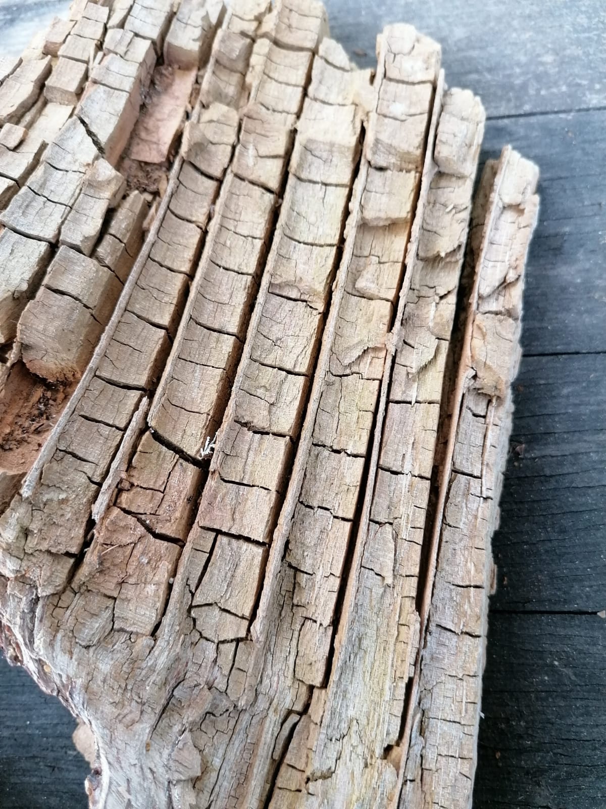 Braunfäule in einem alten Obstbaum, die Cellulose wurde durch einen Pilz abgebaut. Zurück bleibt das würfelförmige Lignin, also der Stoff der die Zellwände in den Bäumen verholzen lässt. Man kann gut die haltbareren Jahrringgrenzen als gerade Bänder erkennen.